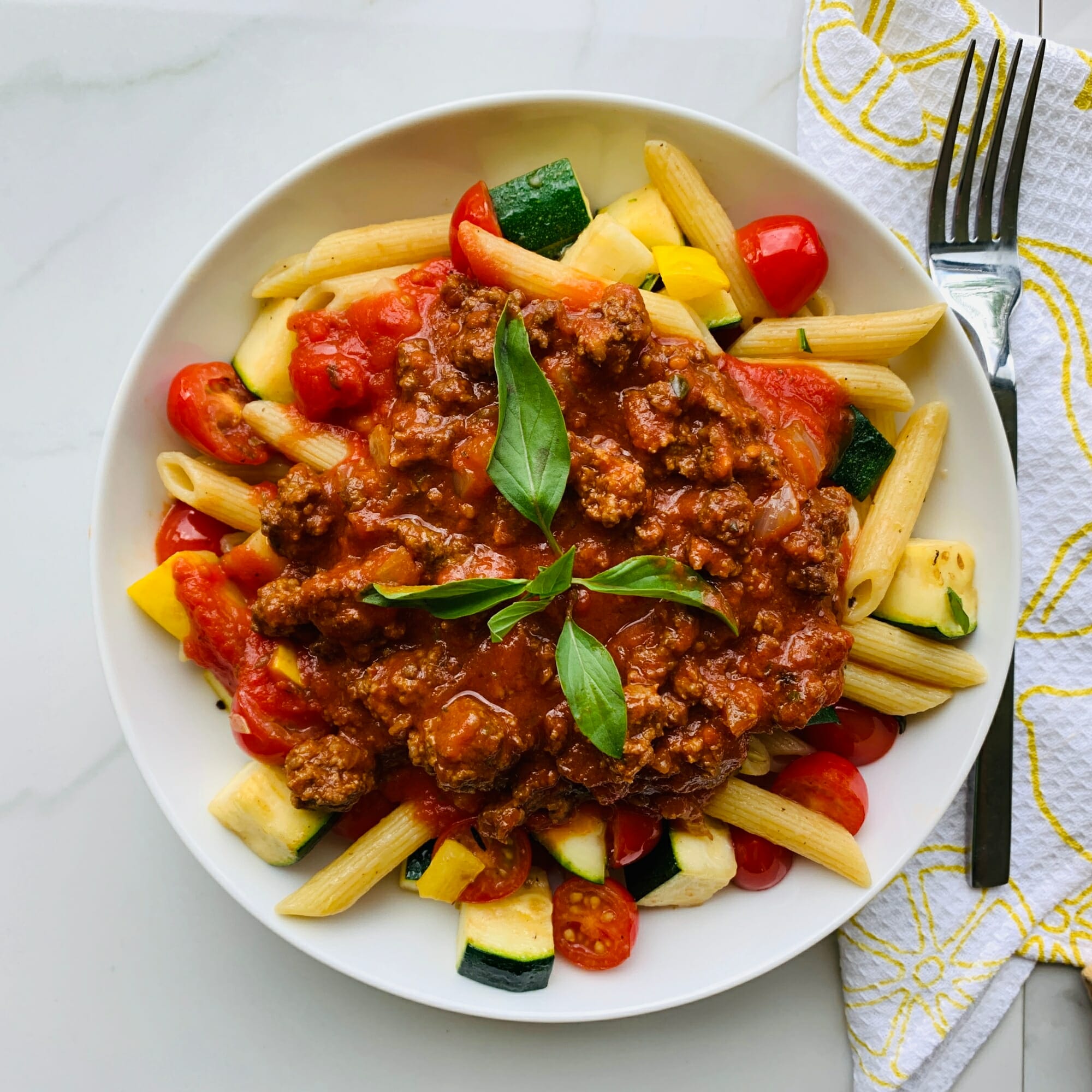 Healthy pasta option with tons veggie: diced zucchini, diced squash, grape tomato cooked with penne pasta(Gluten free option available) and a hearty meat sauce (carrots, celery, onion, lean ground beef, red wine, garlic fresh basil, and tomato sauce); Our house made tomato sauce will not leave a sour after taste because we use tomato without added citric acid