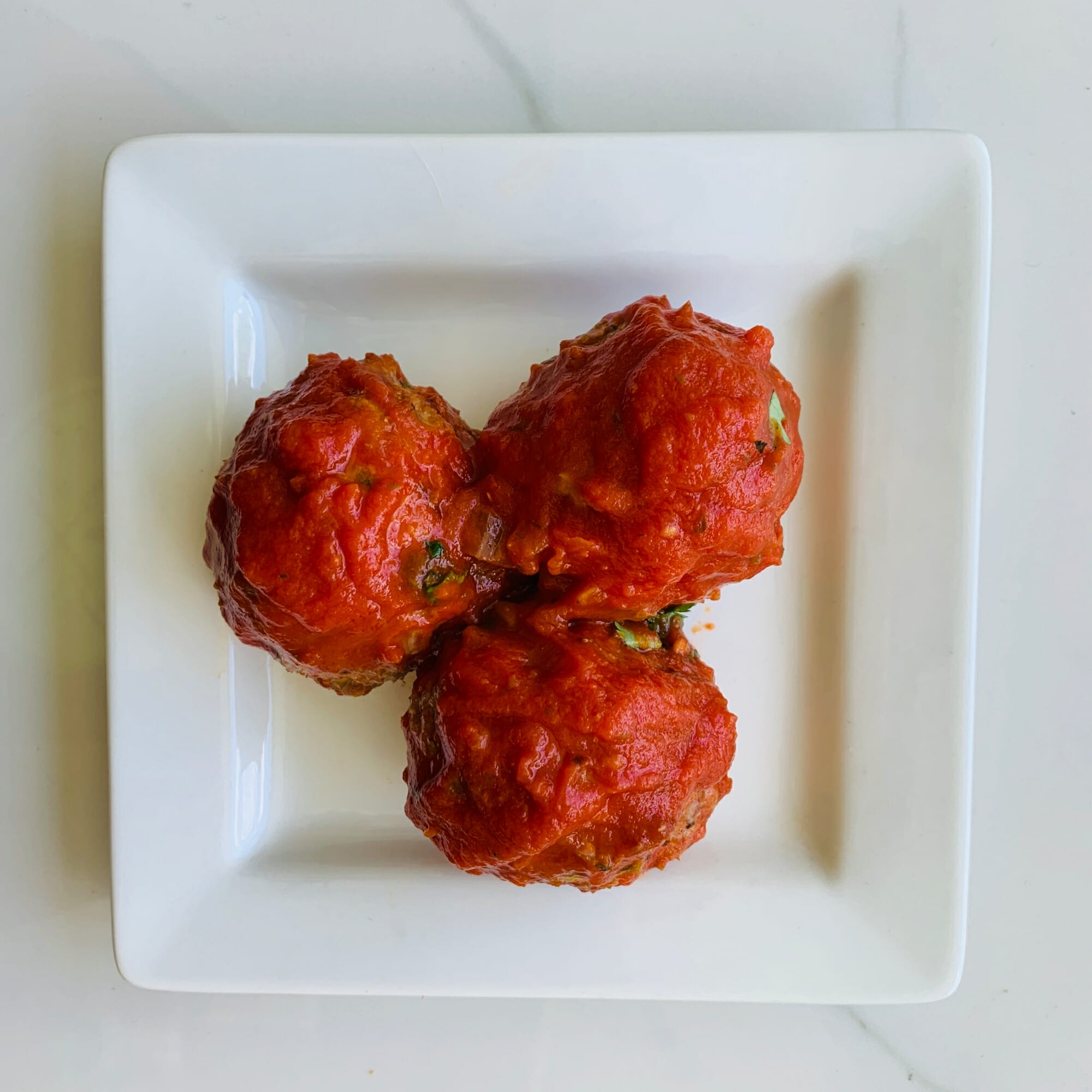 Lean ground beef meatballs mixed with parmesan cheese, panko breadcrumbs, shredded carrots and zucchini, topped with house made tomato basil sauce. (3 meatballs) (GF and Dairy free available upon request)