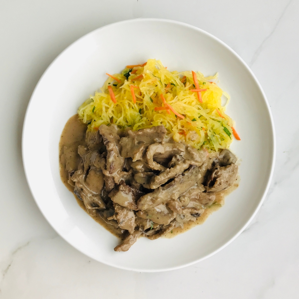 Pan seared flank steak cooked with mushroom and coconut milk serve with spaghetti squash (4 servings; Nutrition information based on 1 serving)