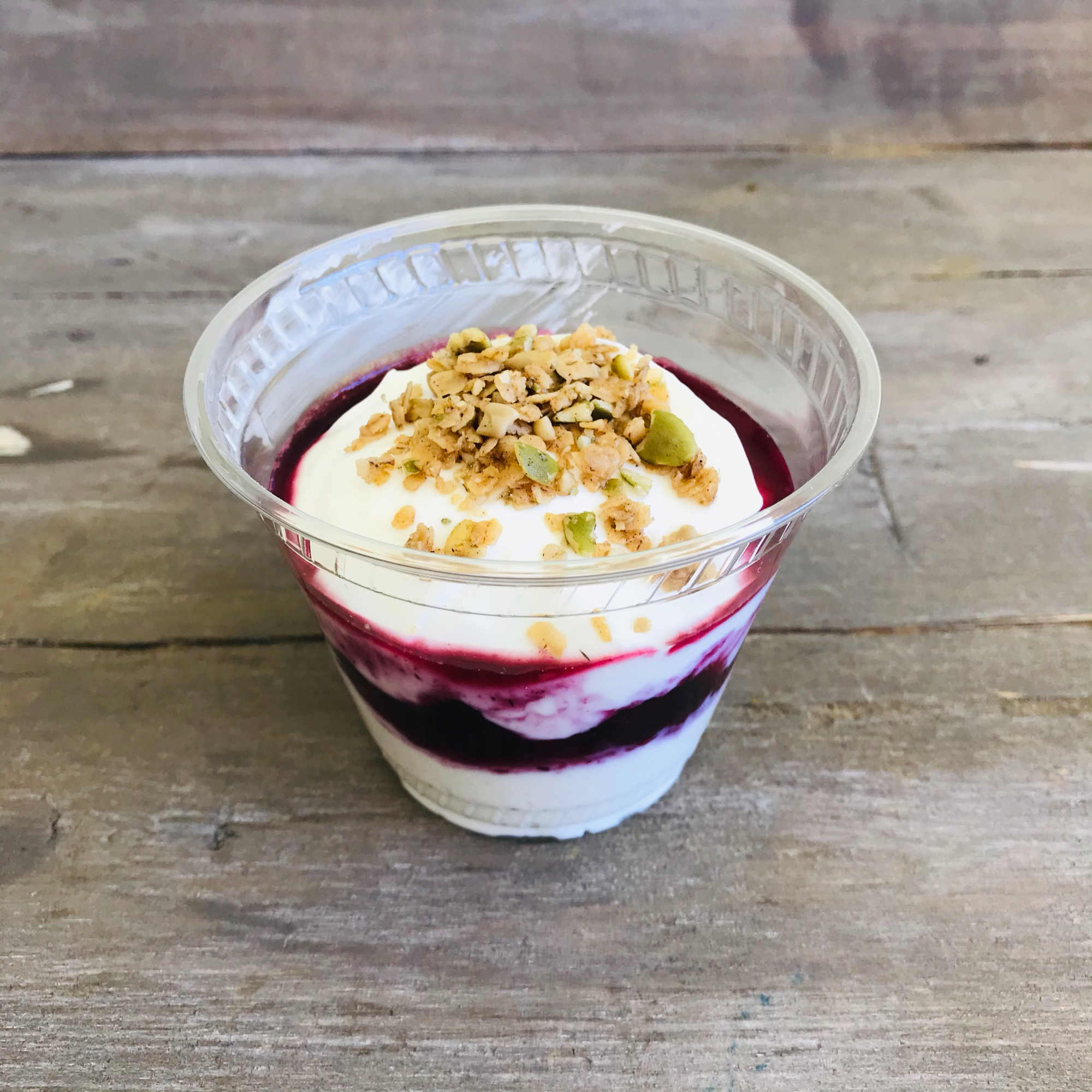 Greek yogurt parfait topped with berry sauce and  house made granola