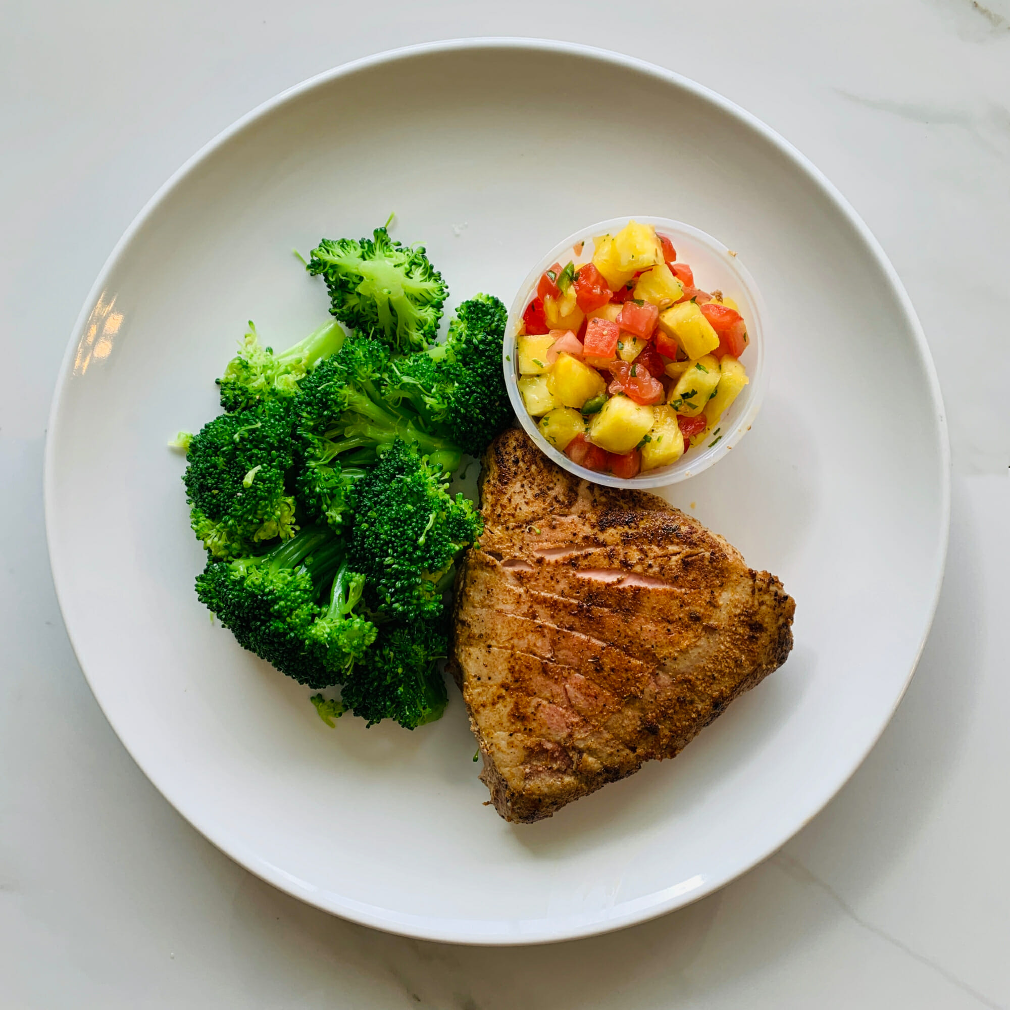 Grilled tuna steak with blackened seasoning served with pineapple salsa (Fresh pineapple, tomato, jalapeno, cilantro and pepper) and broccoli