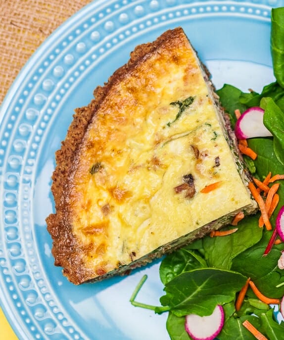 Pie dough crust(or sweet potato), egg, heavy cream, pork sausage, cheddar cheese, and freshly chopped spinach