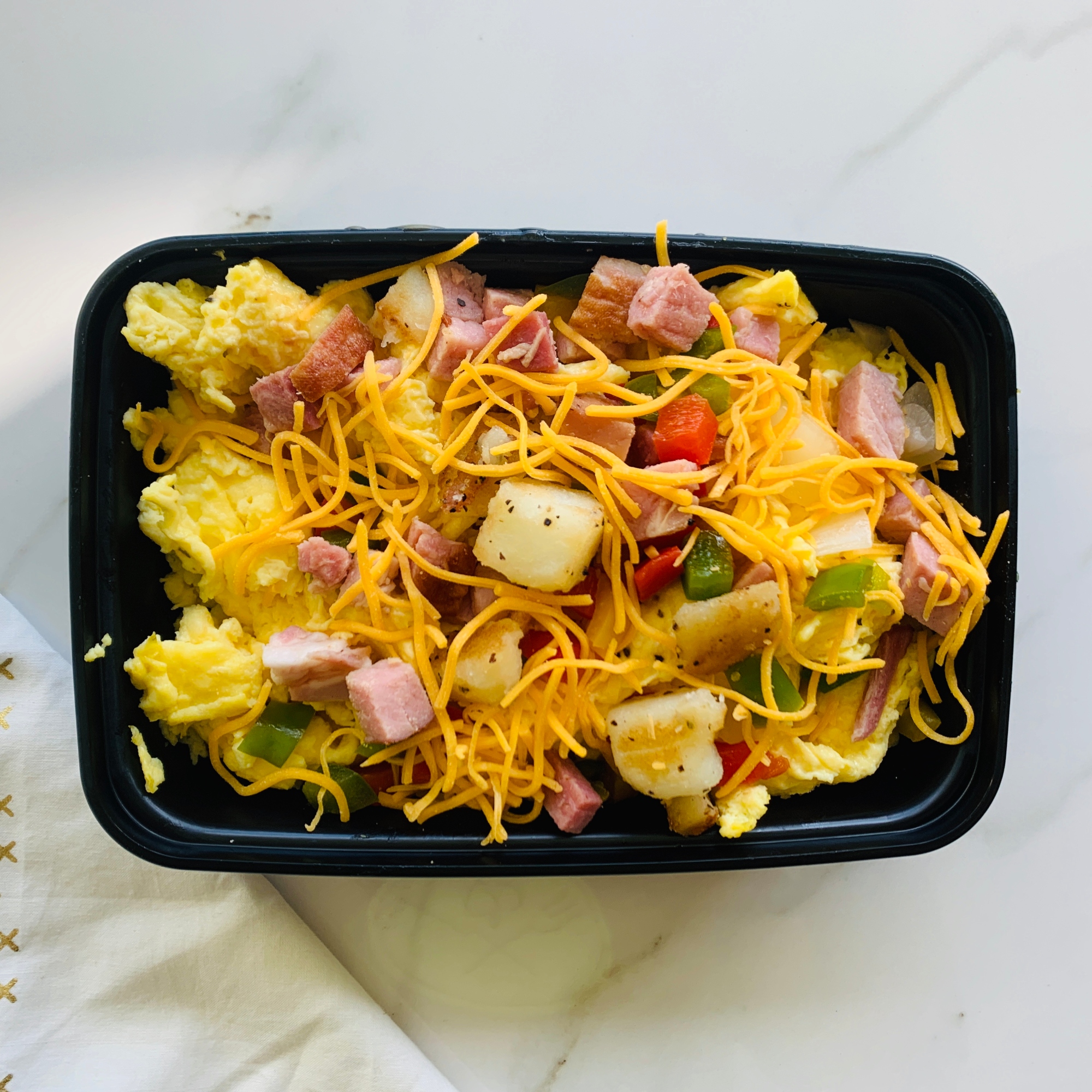 A filling breakfast bowl featuring scrambled eggs, diced potatoes, diced bell pepper, ham, onion, and cheese(4 servings; Nutrition information is based on 1 serving)