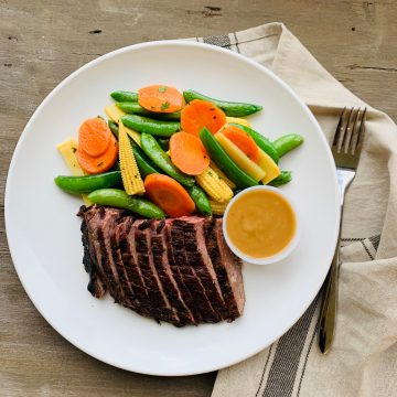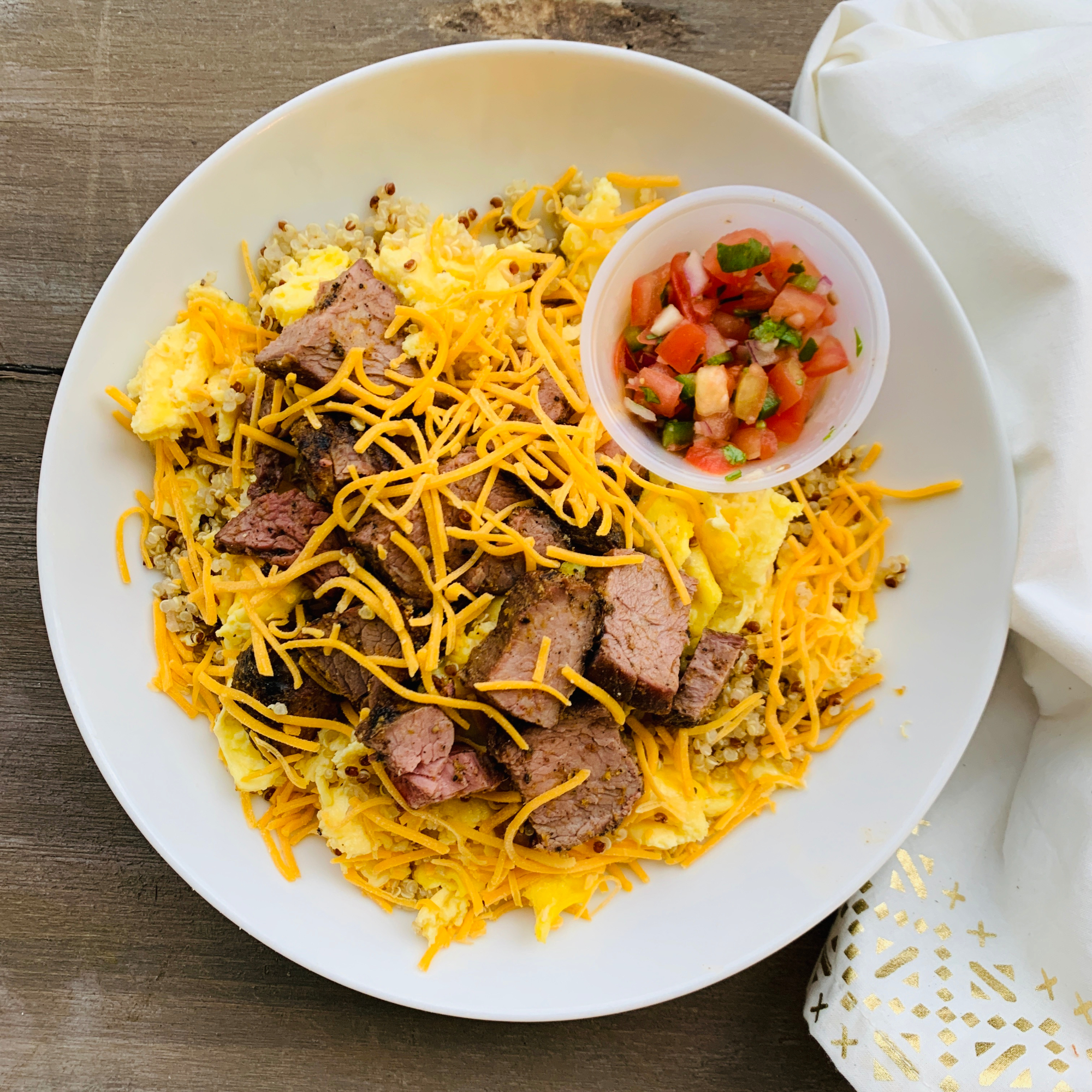 Flank steak, egg, quinoa scramble topped with pico de gallo (on the side)and shredded cheese(optional).