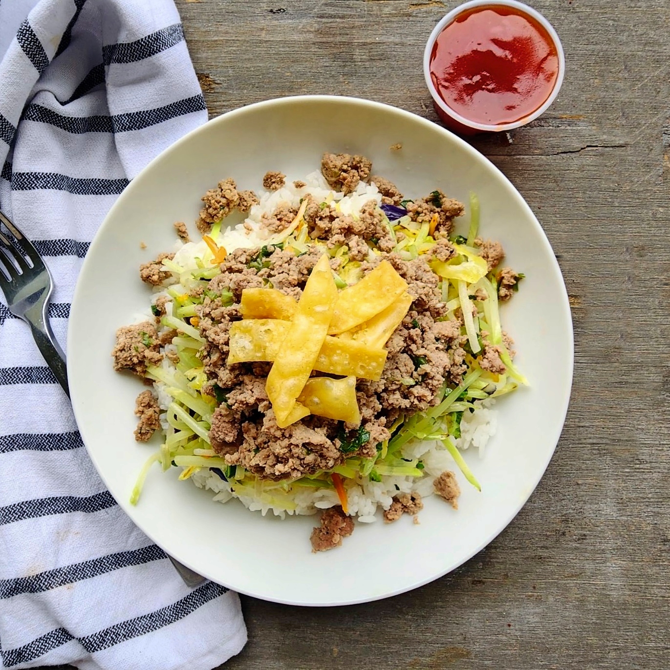 It’s like eating delicious filling of an egg roll. Braised ground chicken (contains sesame oil) , topped with sautéed slaw mix of shredded green cabbage, red cabbage, carrot, kohlrabi and brussels sprouts, served over jasmine rice, wonton strip( contains gluten, package separately), sweet and sour sauce(package separately) and garnish with chives