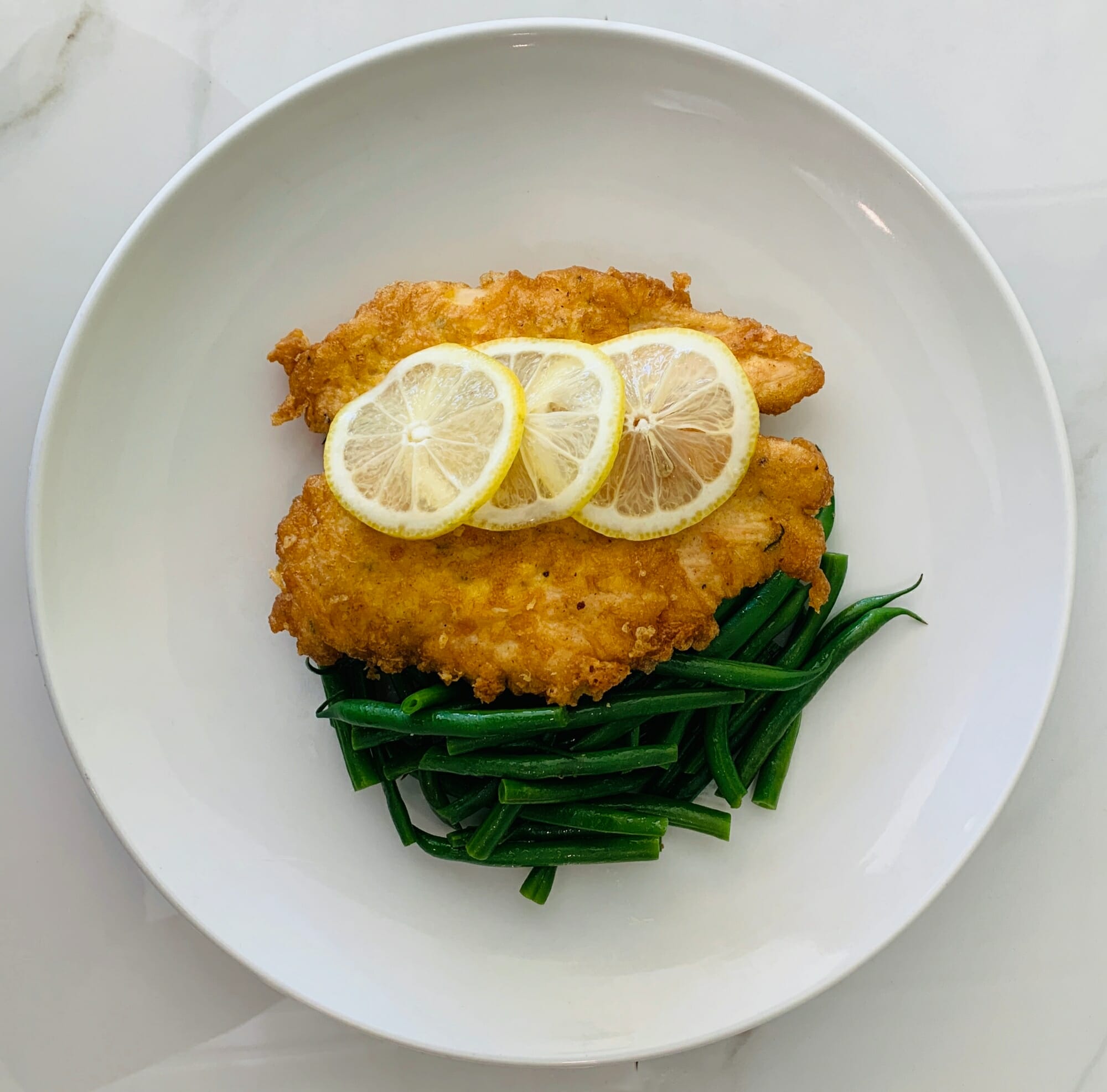 Chicken breast lightly coated with gluten free rice flour, coated in an egg and Romano cheese mixture, and pan seared to perfection served with French green beans(4 servings; Nutrition information is based on 1 serving)