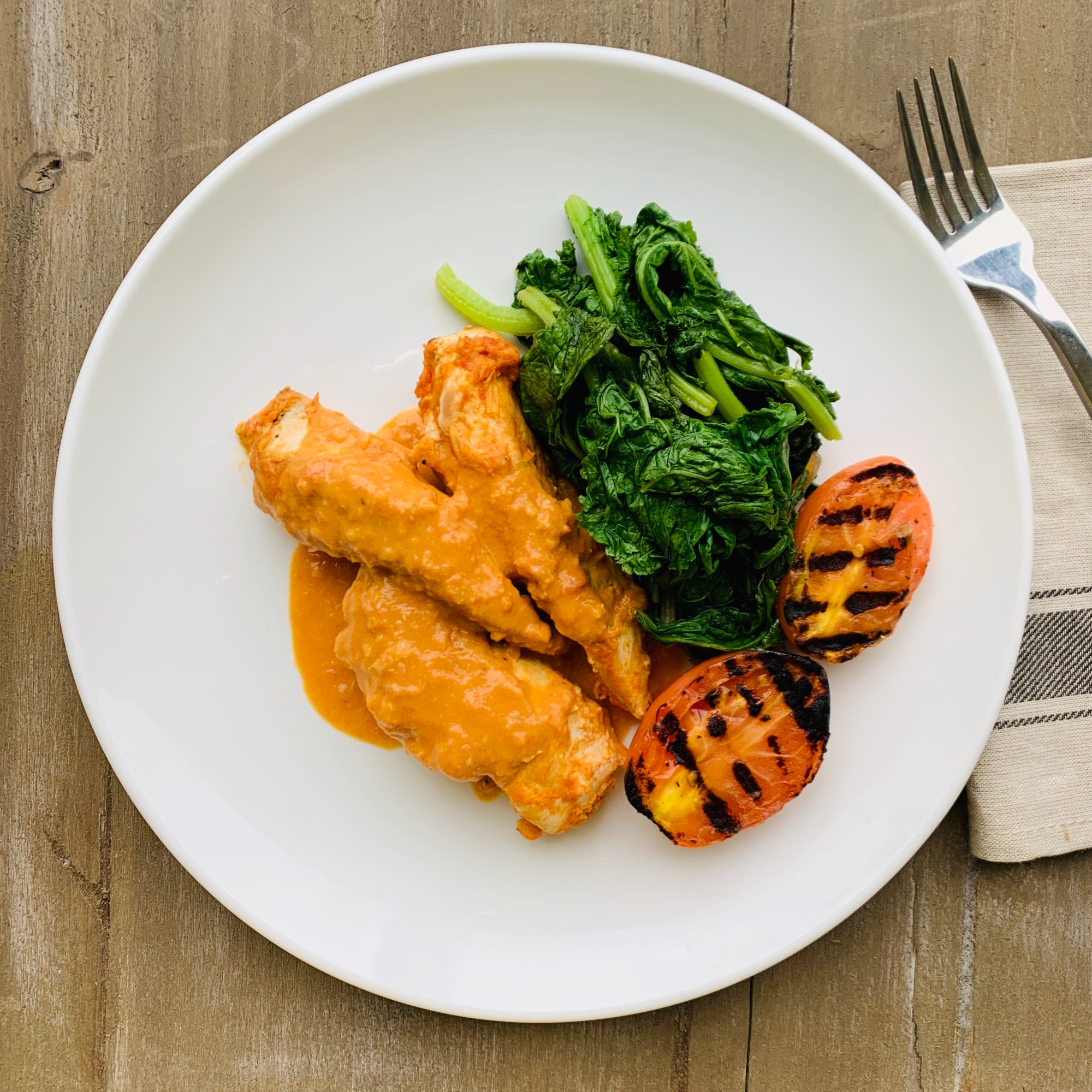 Pan seared chicken breast cooked in sundries tomato and basil coconut cream sauce served with steam broccoli and oven roasted tomato