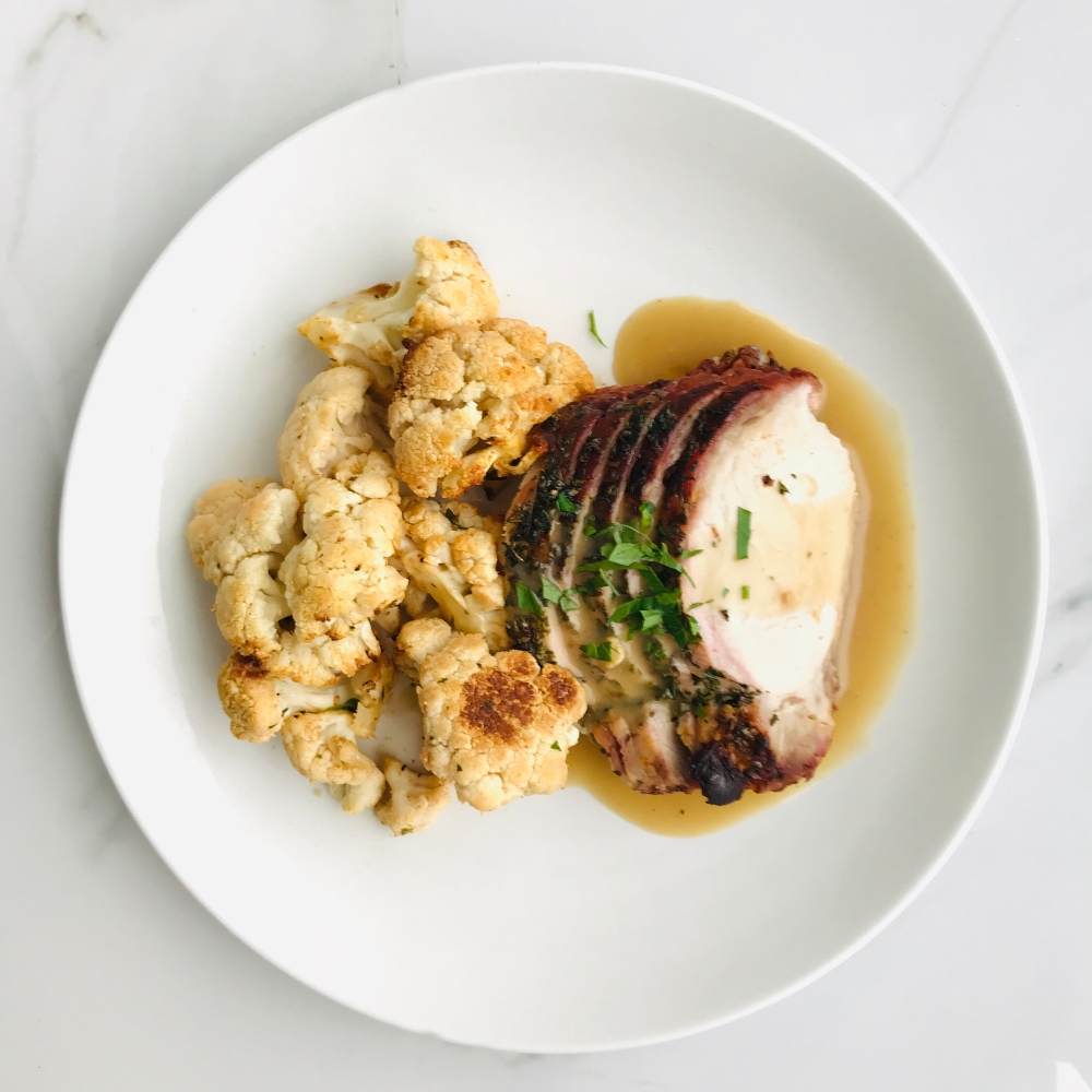 Roasted lean pork loin brine for 24 hours and then marinated with fresh herb and topped with pork gravy served with roasted cauliflower
