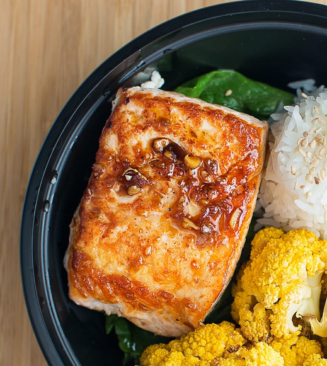 Salmon filet cooked in orange juice, honey, garlic and gluten free soy glazed ginger sauce servedĀ steamed broccoli (GF and dairy free)
