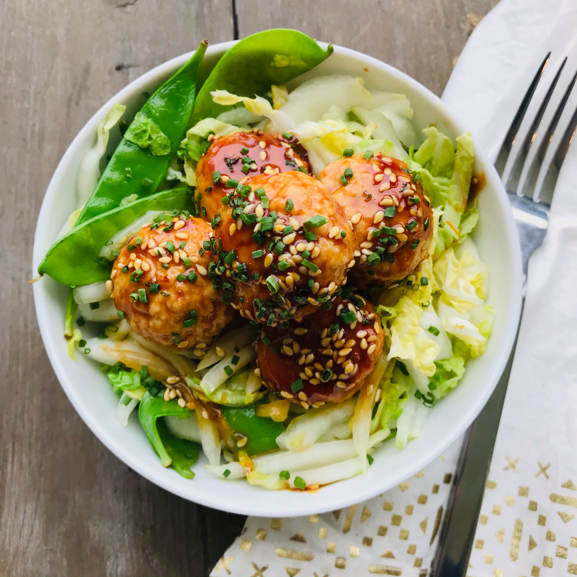 Ground chicken meatballs tossed with honey sriracha glaze served with sautéed Napa cabbage, snow peas and bok choy(Gluten free meatballs available upon request)