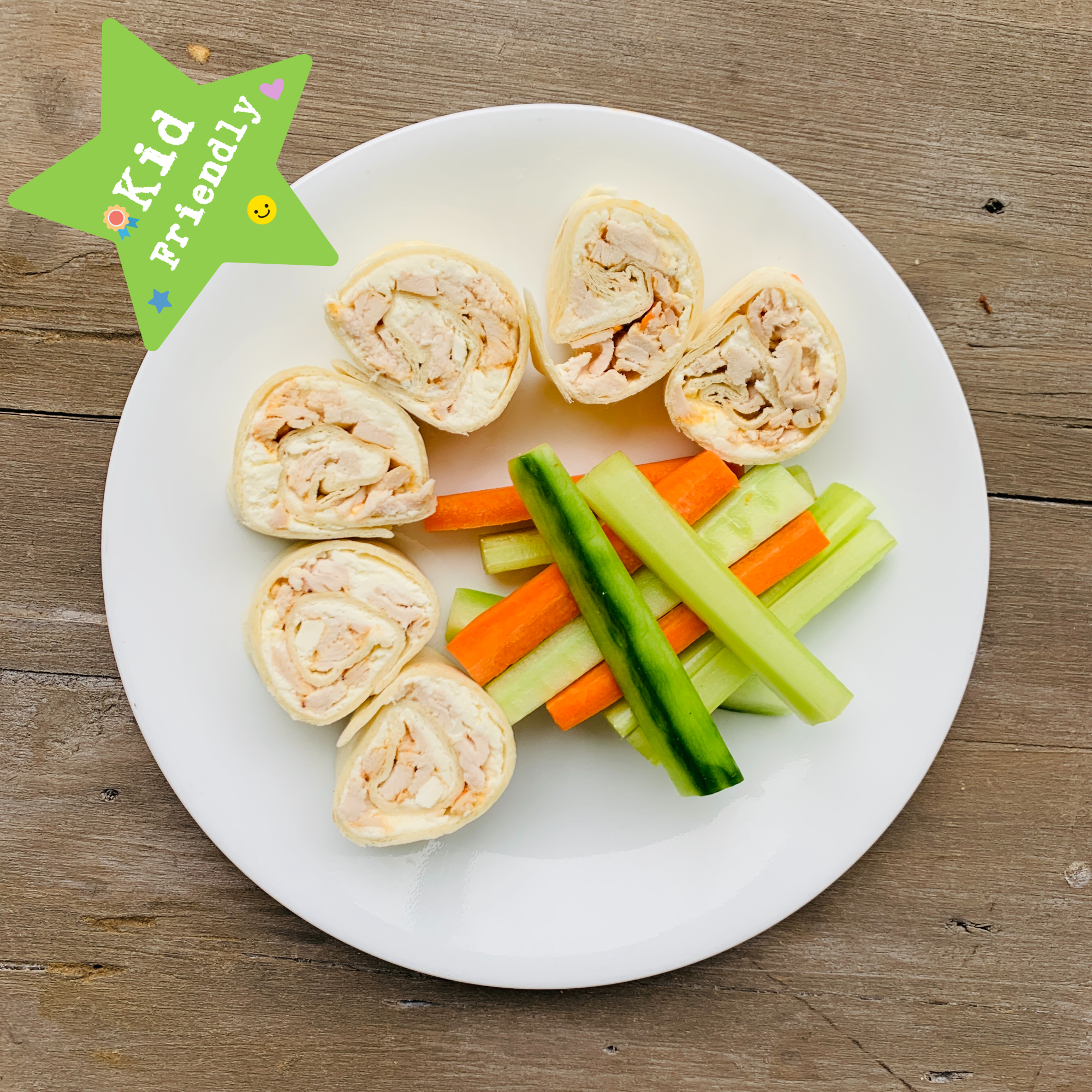 Shredded chicken breast, cream cheese tortilla rolls up with veggie sticks (carrot, celery and cucumber)