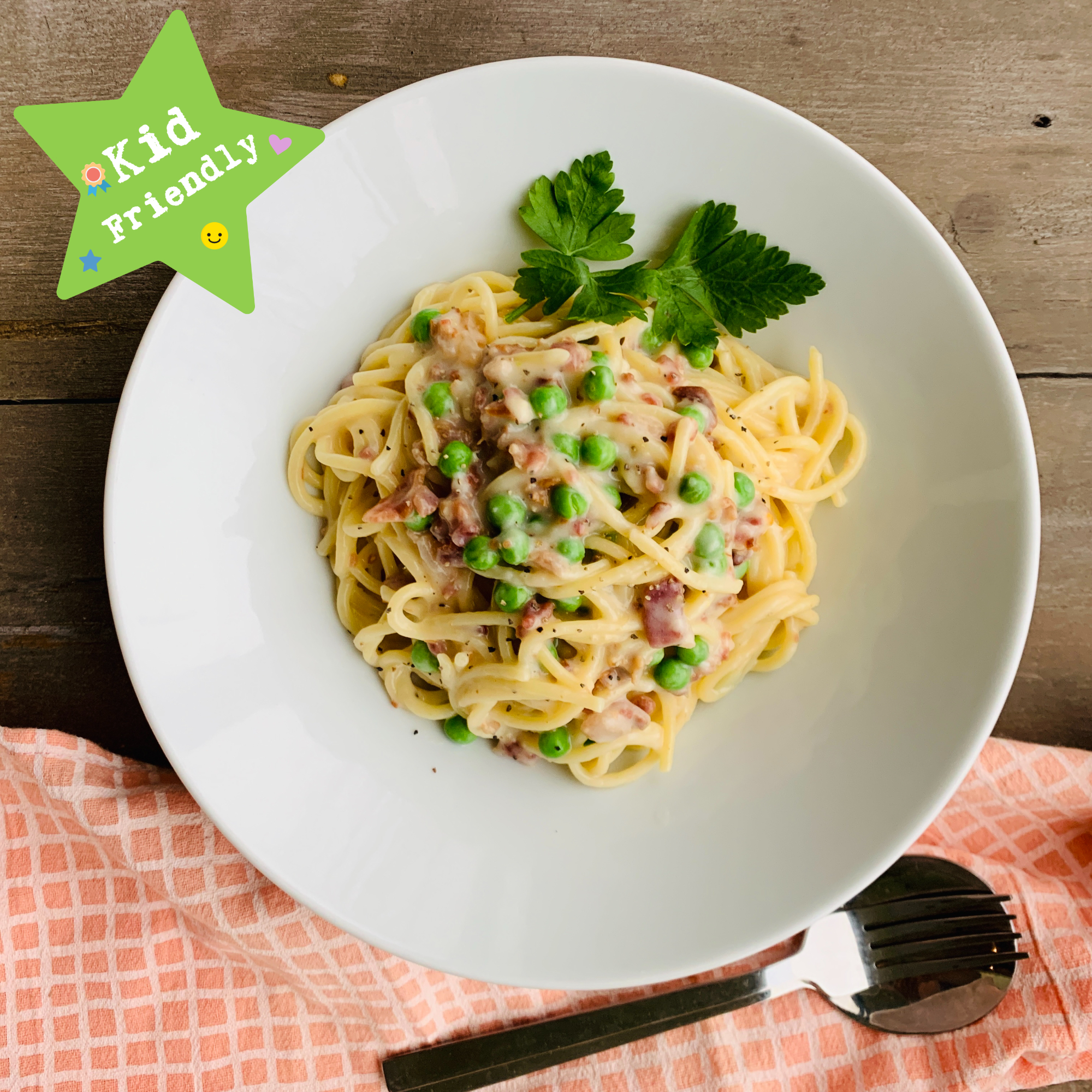 Simple ingredients, 100% fresh. spaghetti noodle, bacon, and topped with parmesan cheese and carbonara sauce on the side