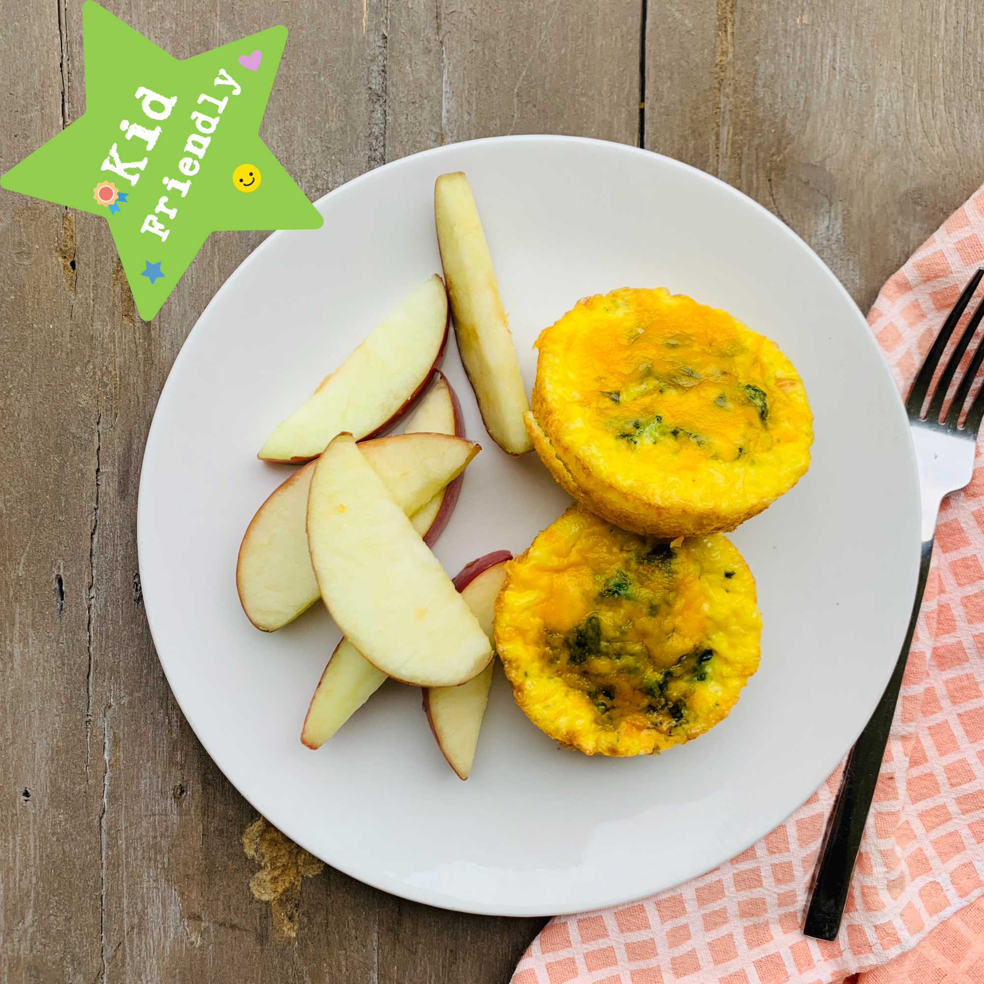 Simple ingredients, 100% fresh. Two spinach, bacon, cheddar cheese egg cups and an apple packet.