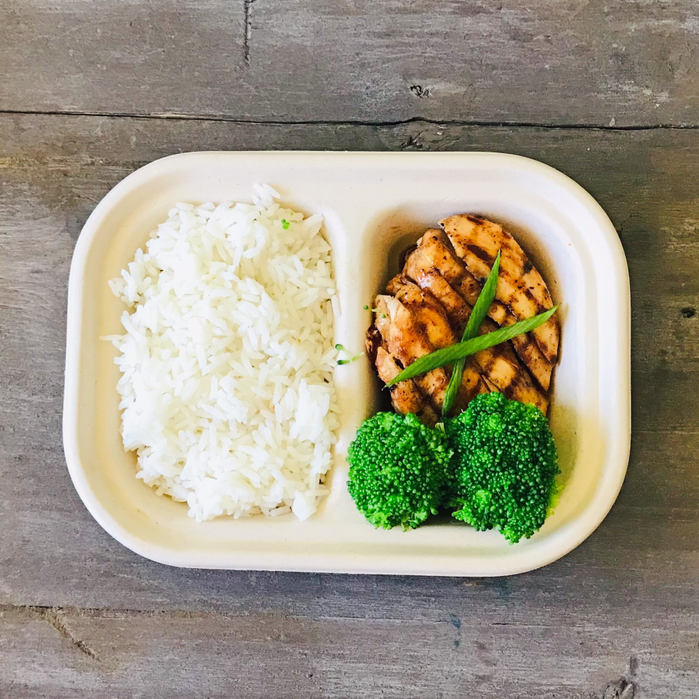 Simple ingredients, 100% fresh. Slice lean chicken breast(5oz raw weight) topped with teriyaki glazed served with broccoli and rice pilaf