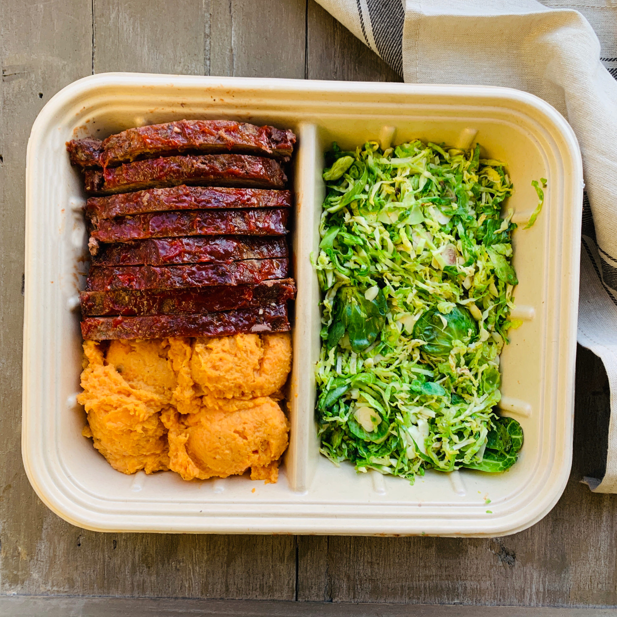 You're viewing: Meatloaf with mashed sweet potato and brussel sprout (Family)$49.99