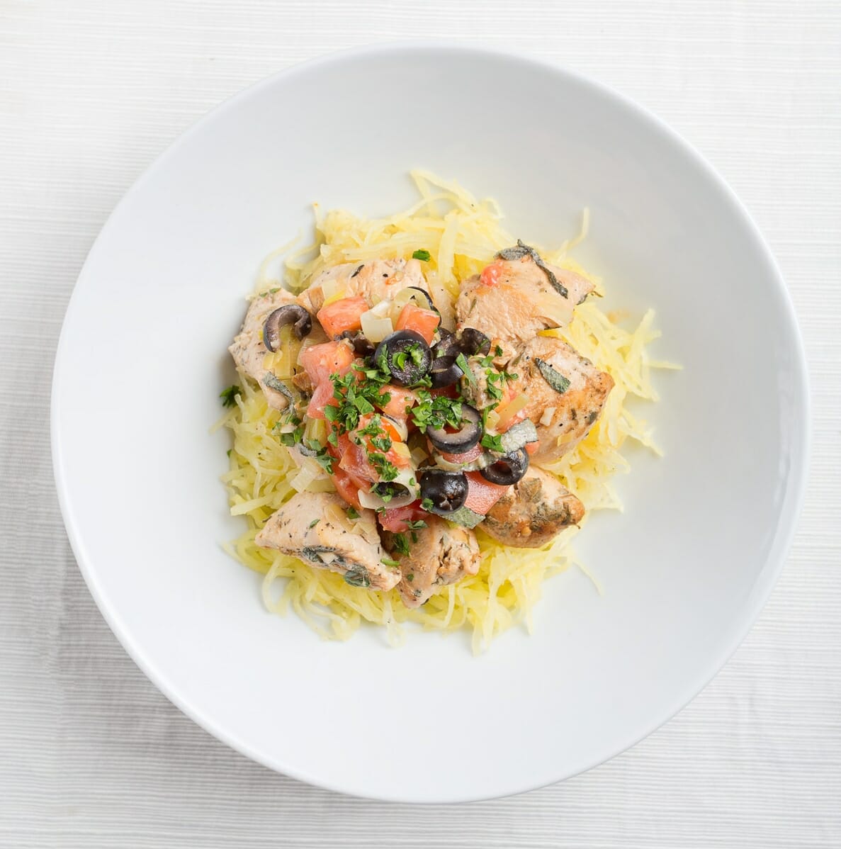chicken breast cooked in cream sauce, olive, diced tomato, leeks serve with spaghetti squash