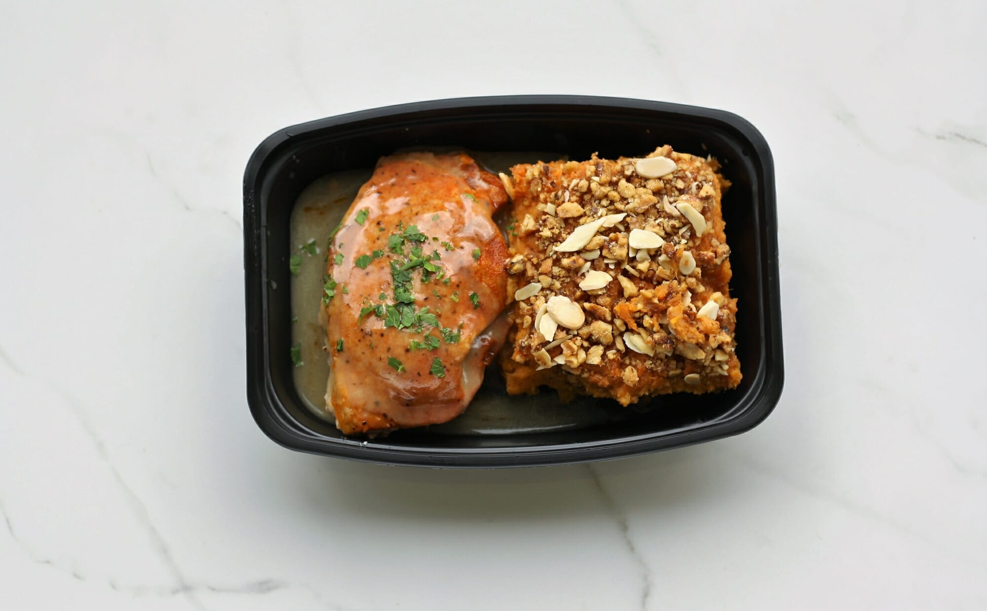 Pork chop with a peach glaze and served with Pittsburgh Fresh’s signature sweet potato casserole (Contains eggs, walnuts, almonds and coconut milk)
