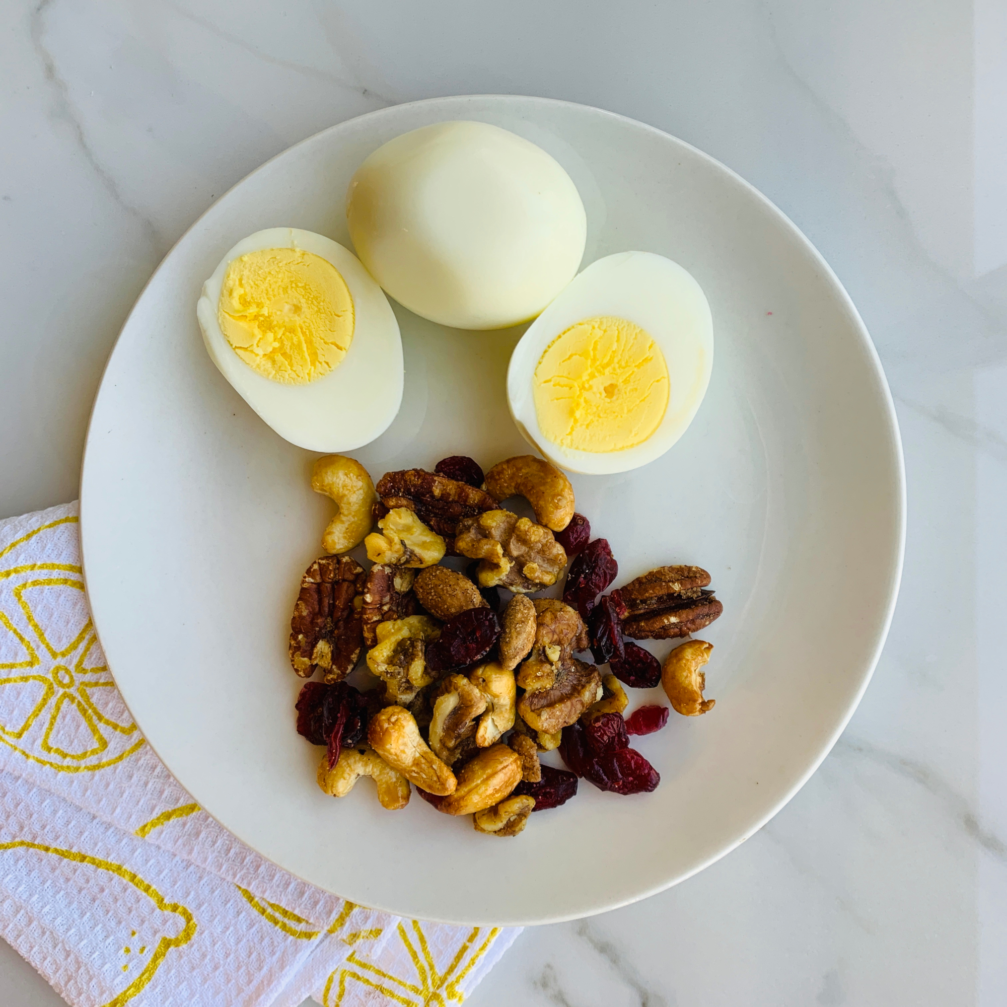 Start your morning right with this protein pack: 2 hard-boiled eggs, mixed nuts, and dried cranberries