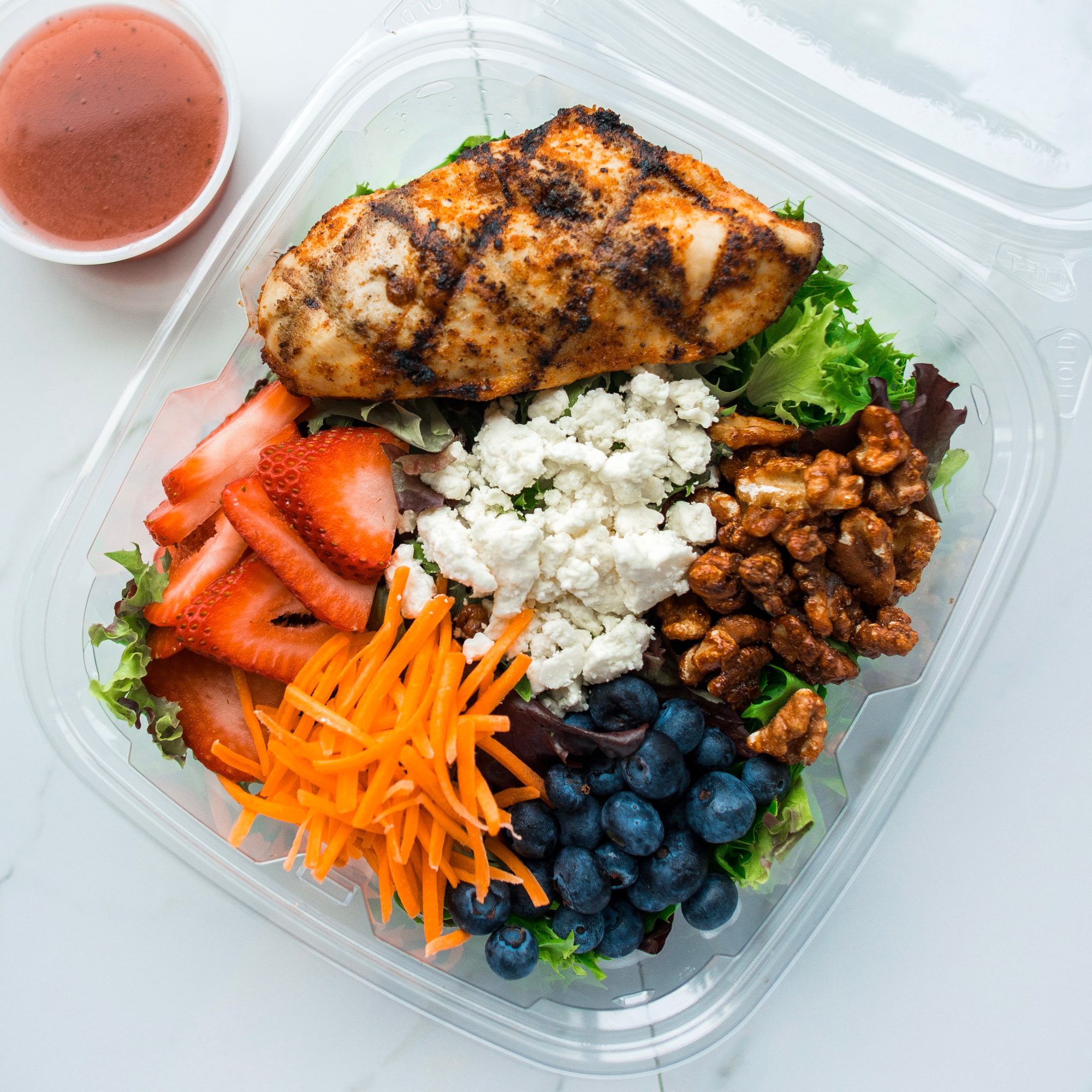 Salmon, spring mix,  blueberries, strawberries, maple walnut , goat cheese, and house made dressings (on the side)