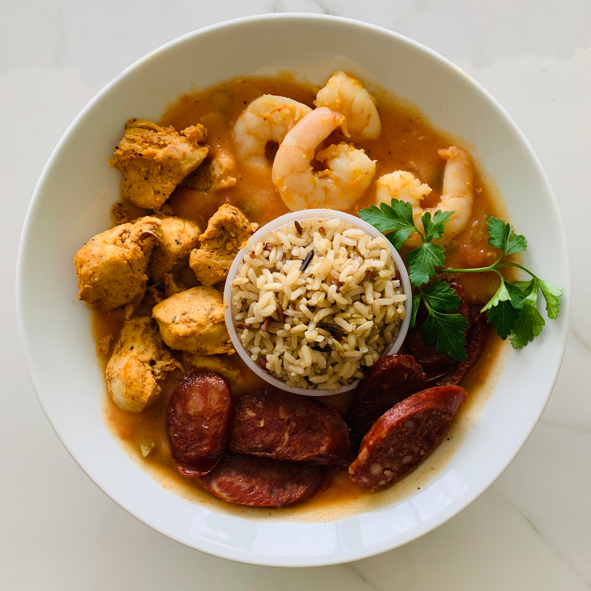 A healthy twist on the traditional New Orleans dish; Deep flavors built with pork andouille sausage, shrimp, chicken, chicken stock, onions, celery, peppers, diced tomatoes, fresh herbs, garlic, and spices.(4 servings; nutritional information for 1 serving)