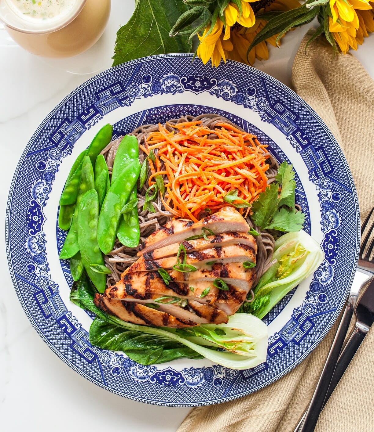 Cold soba noodle, grilled chicken breast, edamame, corn, green bean, shredded carrots, cilantro and scallion serve with ginger peanut soy dressing