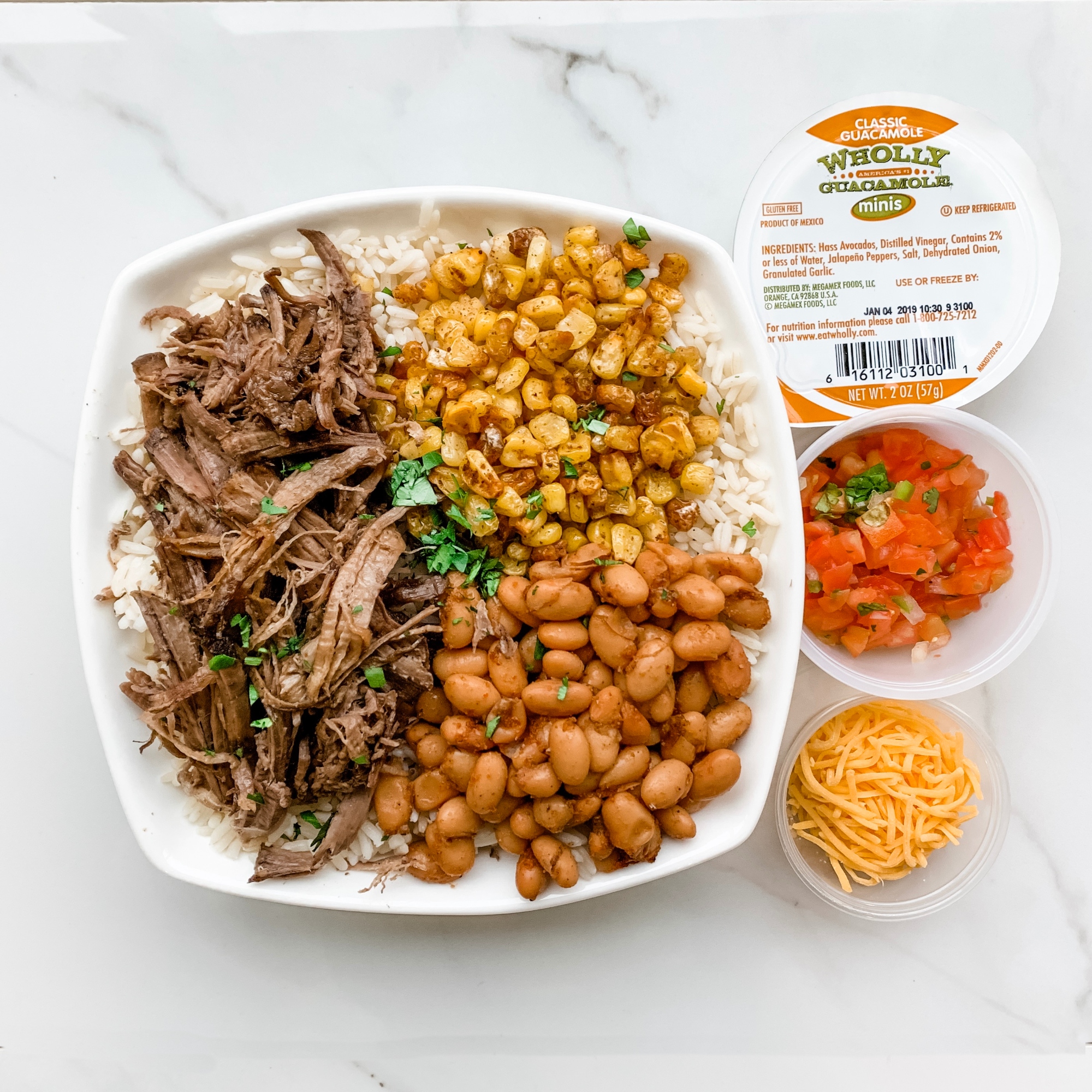 This Burrito Bowl is incredibly delicious, healthy, and festive. Tender shredded beef topped on lime-cilantro rice(or quinoa), corn, homemade salsa, Wholly’s guacamole pack, pinto beans and cheese on the side