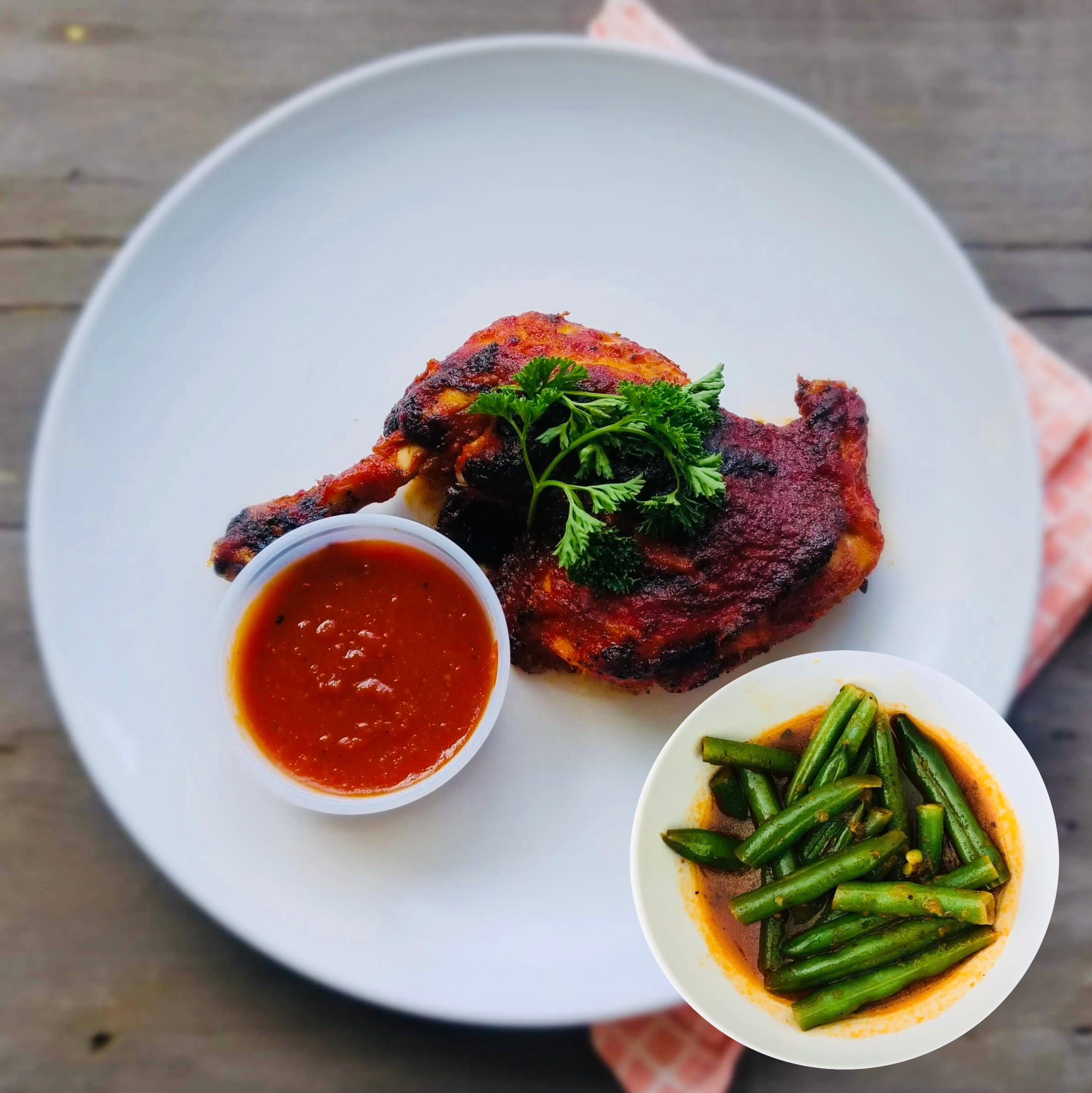 Smoky, tangy and sweet BBQ chicken leg quarters served with braised green bean