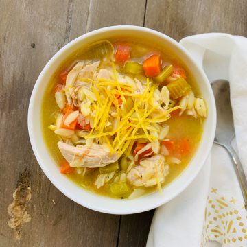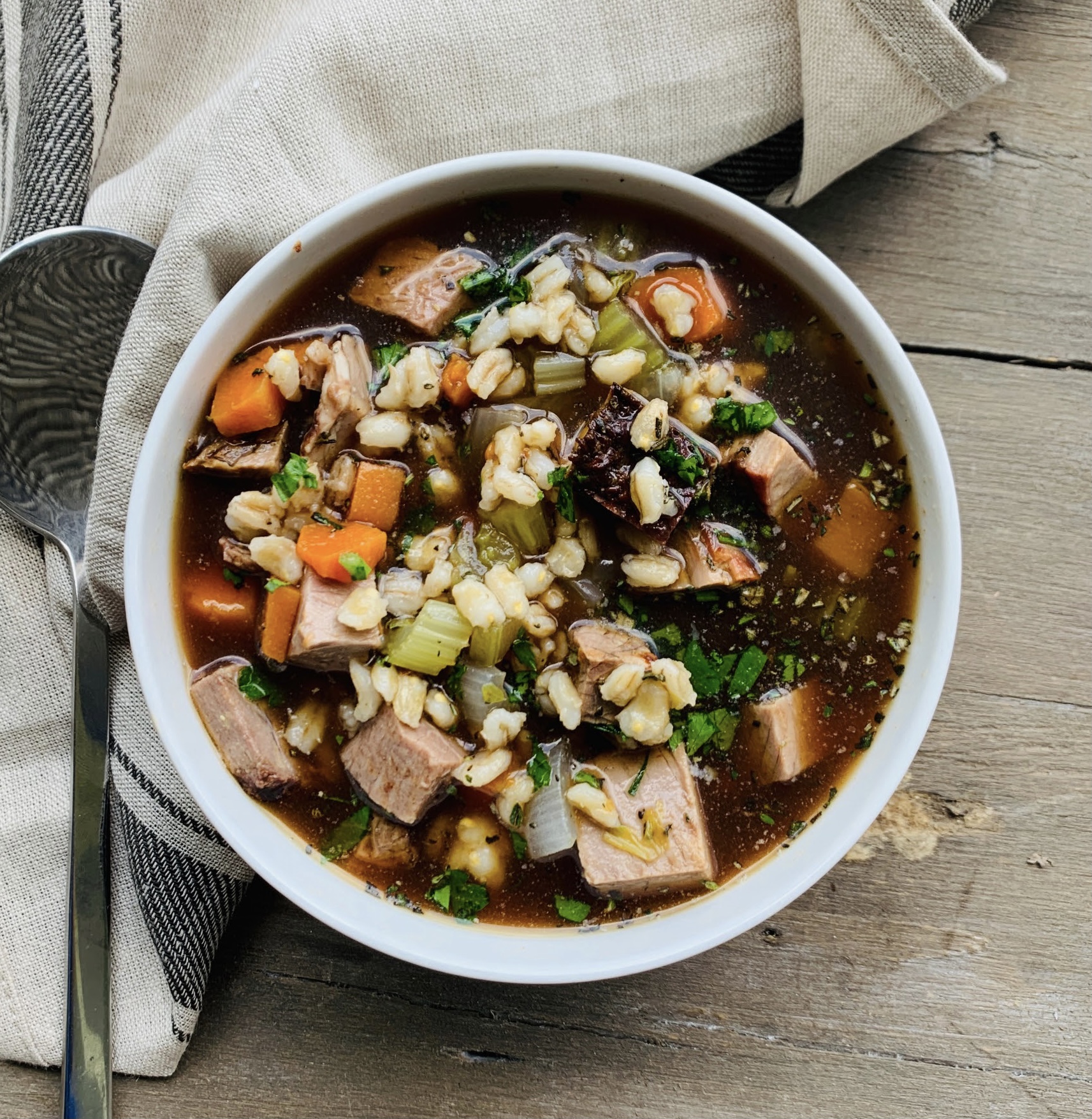 Just like every other soup we made; the broth is made with 3 days of TLC. First we roast beef bones and vegetables, then simmer them for 8-10 hours, then we added fresh cut beef, tones of vegetables and finished with barley.