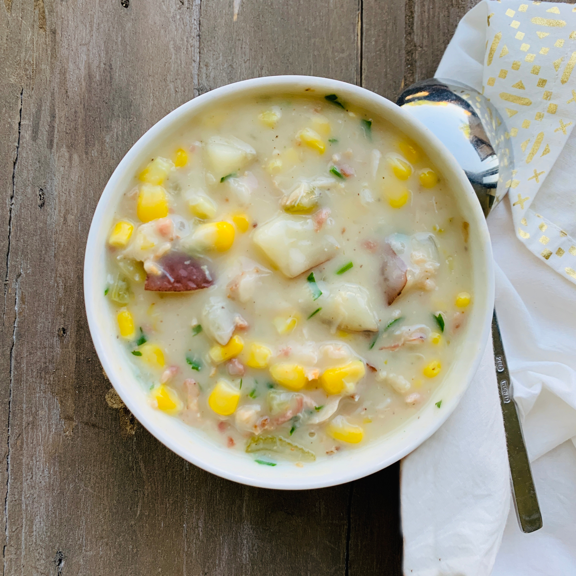 Idaho potatoes (or sweet potatoes), salmon, bacon, sweet corn, celery, onion and heavy cream cooked in clam juice