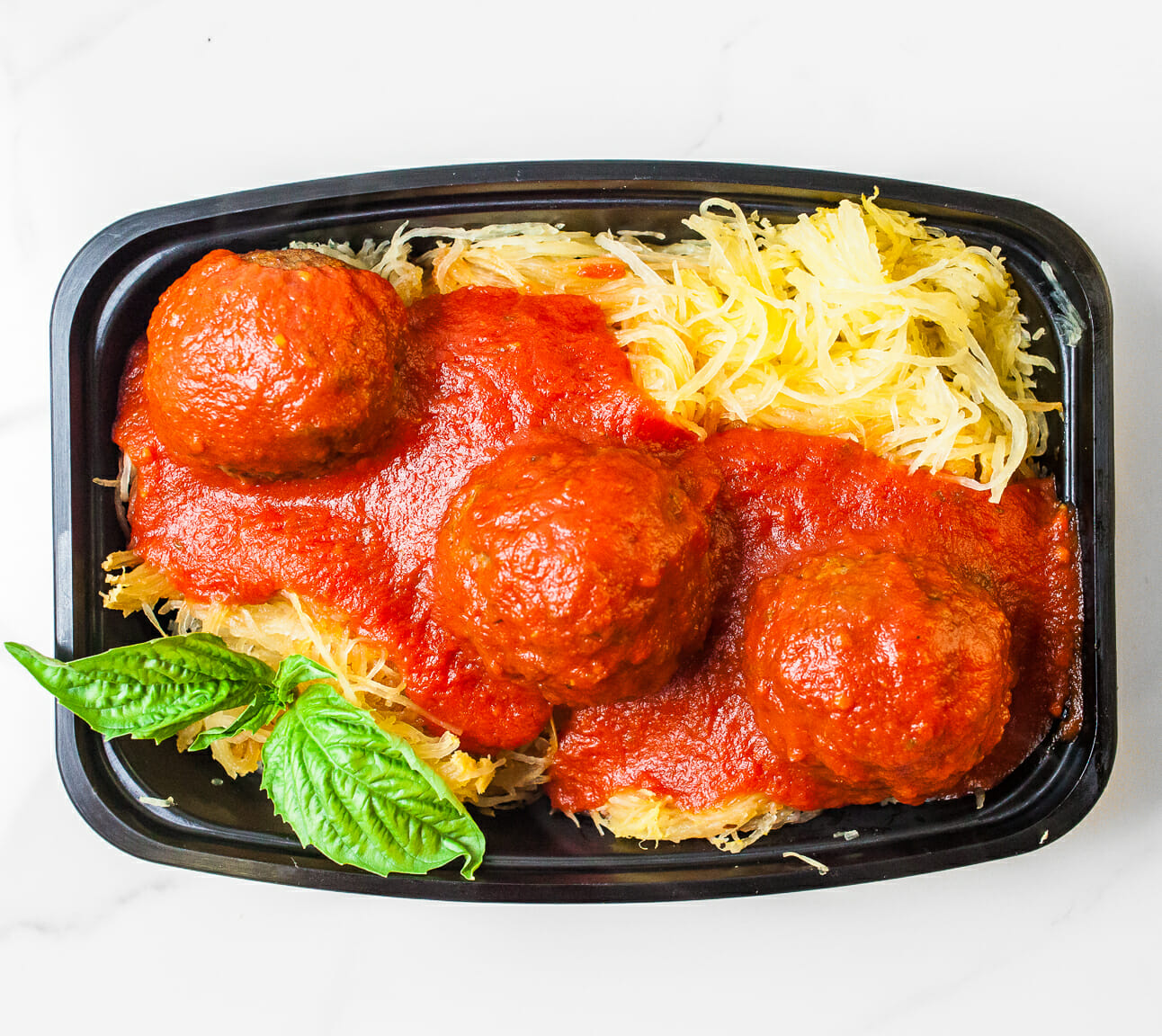 Lean ground beef meatballs cooked in house made tomato basil sauce, served with spaghetti squash and steamed broccoli (Meatballs will be made GF and dairy free if you have that listed on your dietary preference)