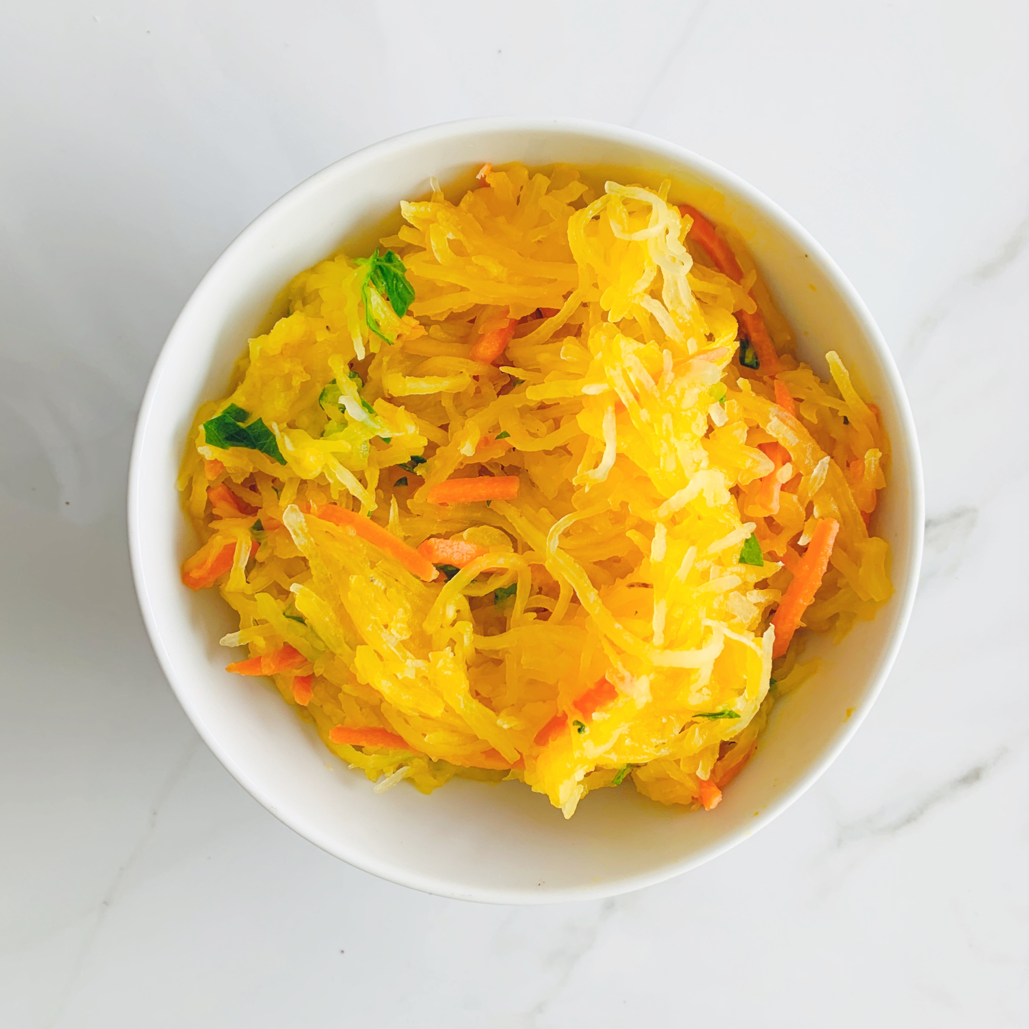 Oven roasted spaghetti squash with sautéed carrots and parsley