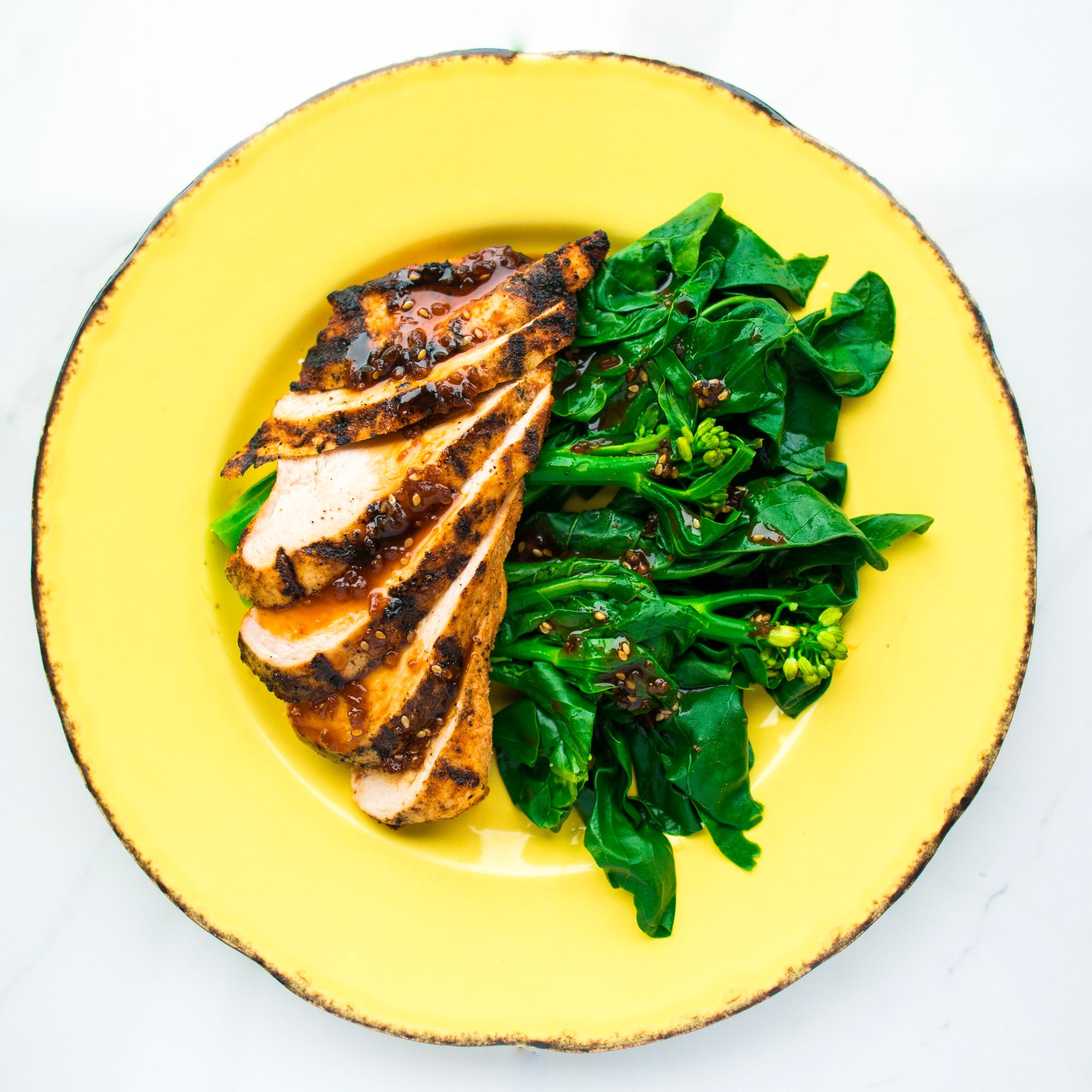 Grilled chicken breast with teriyaki soy glaze served with steamed Chinese broccoli