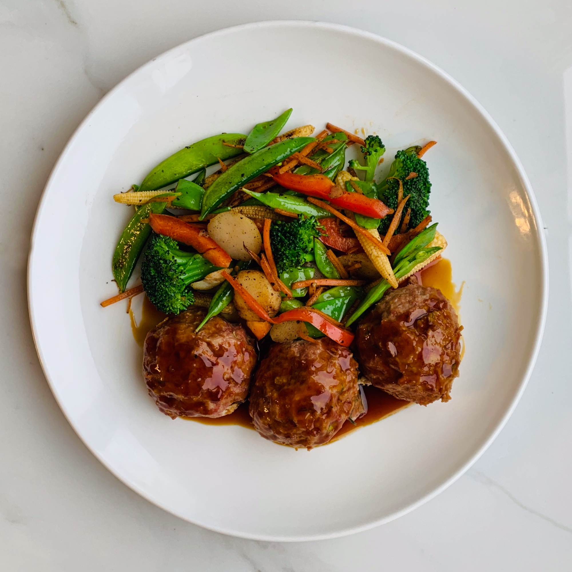 Lean ground turkey and vegetable meatballs tossed with gluten free teriyaki sauce served with Asian vegetables(snow peas, bamboo shoots, snow pea and baby corn)