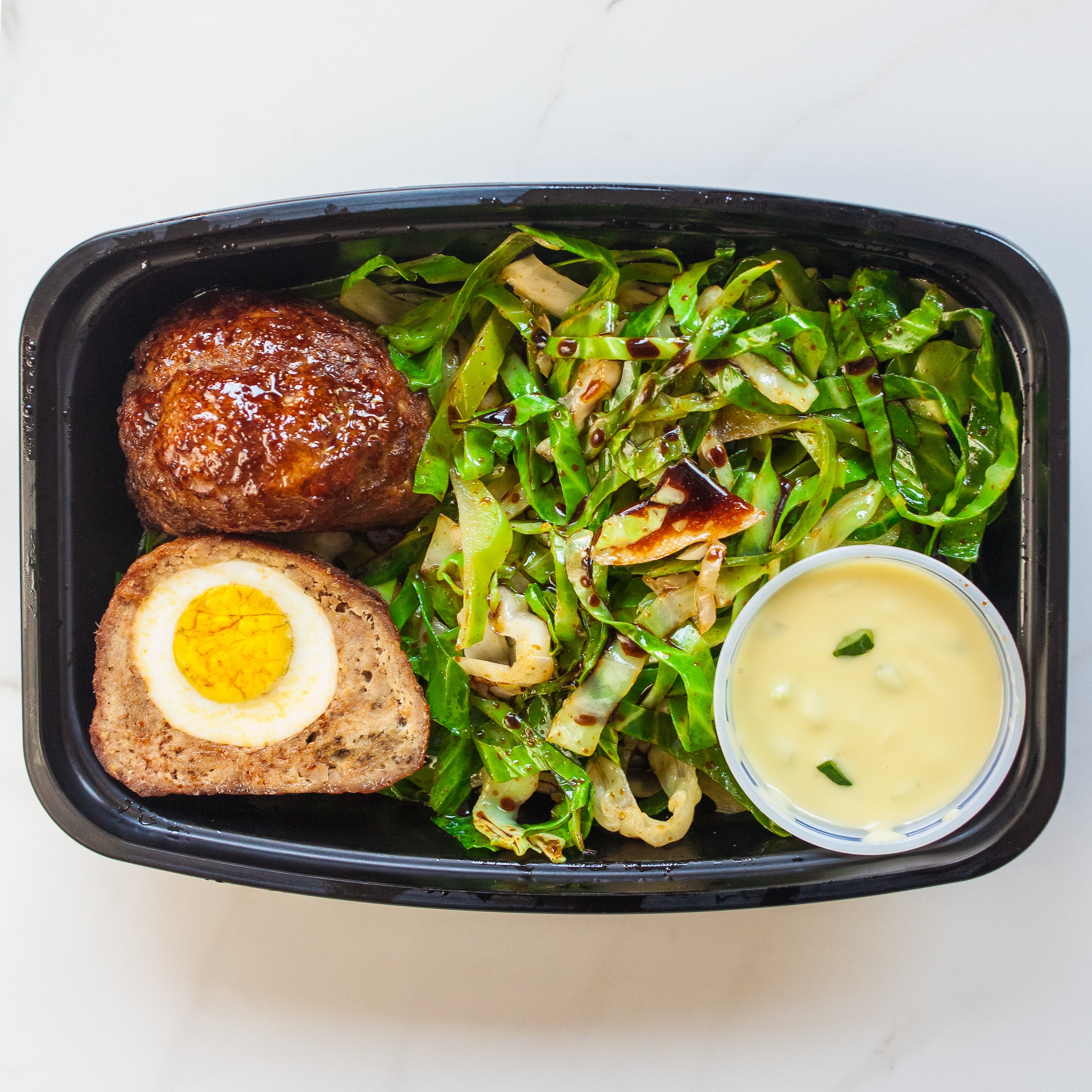 Creamy and smooth hardboiled free range local eggs wrapped in crispy baked ground turkey mixture served with tzatziki sauce on the side(Greek yogurt, cucumber and seasoning) and stir fried cabbage noodle