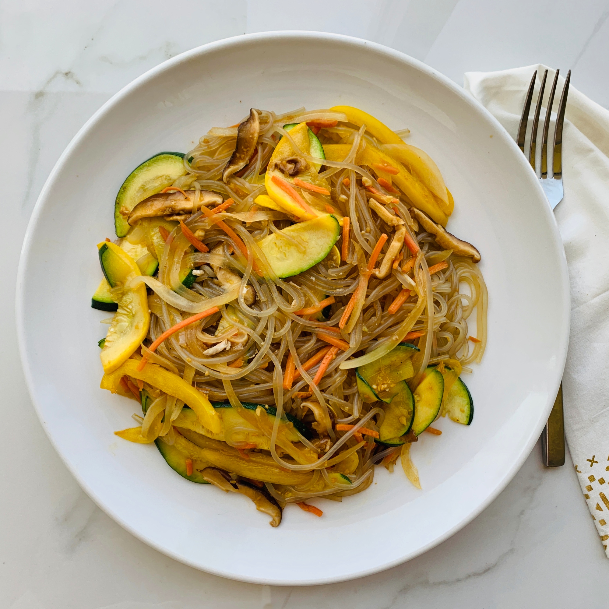 Traditional Korean noodle made with sweet potato starch cooked with assorted vegetables and tossed with gluten free soy sauce sesame oil sauce (gluten free, contained soy)