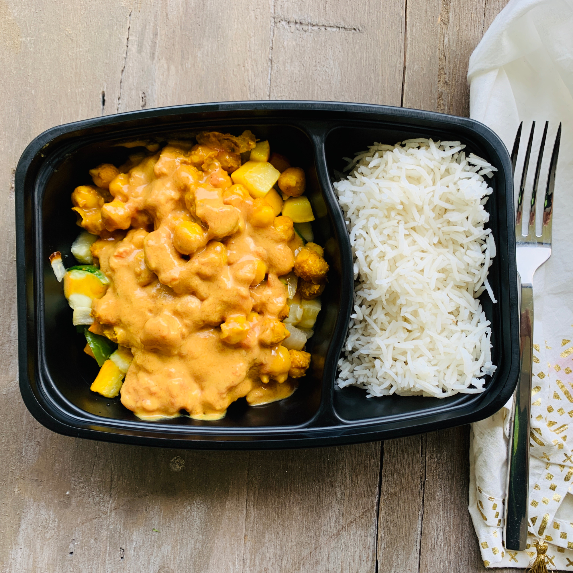 Chick peas stewed with curry spices and a tomato coconut cream sauce served with broccoli and basmati rice