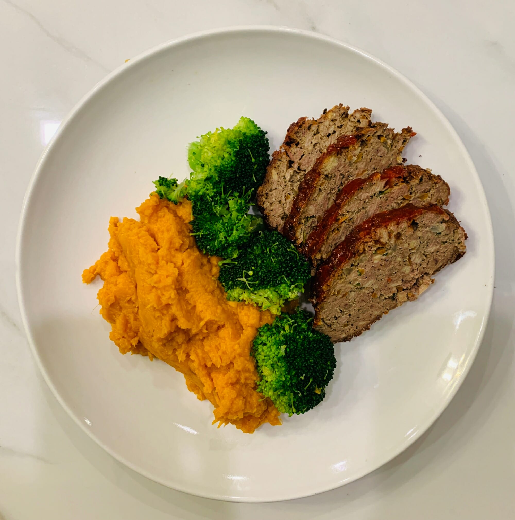 Impossible burger “meat”, which is made from simple ingredients found in nature, including wheat protein, coconut oil, potato protein, and heme plus our house made spice mix and lots of shredded vegetables served with mashed sweet potato and broccoli