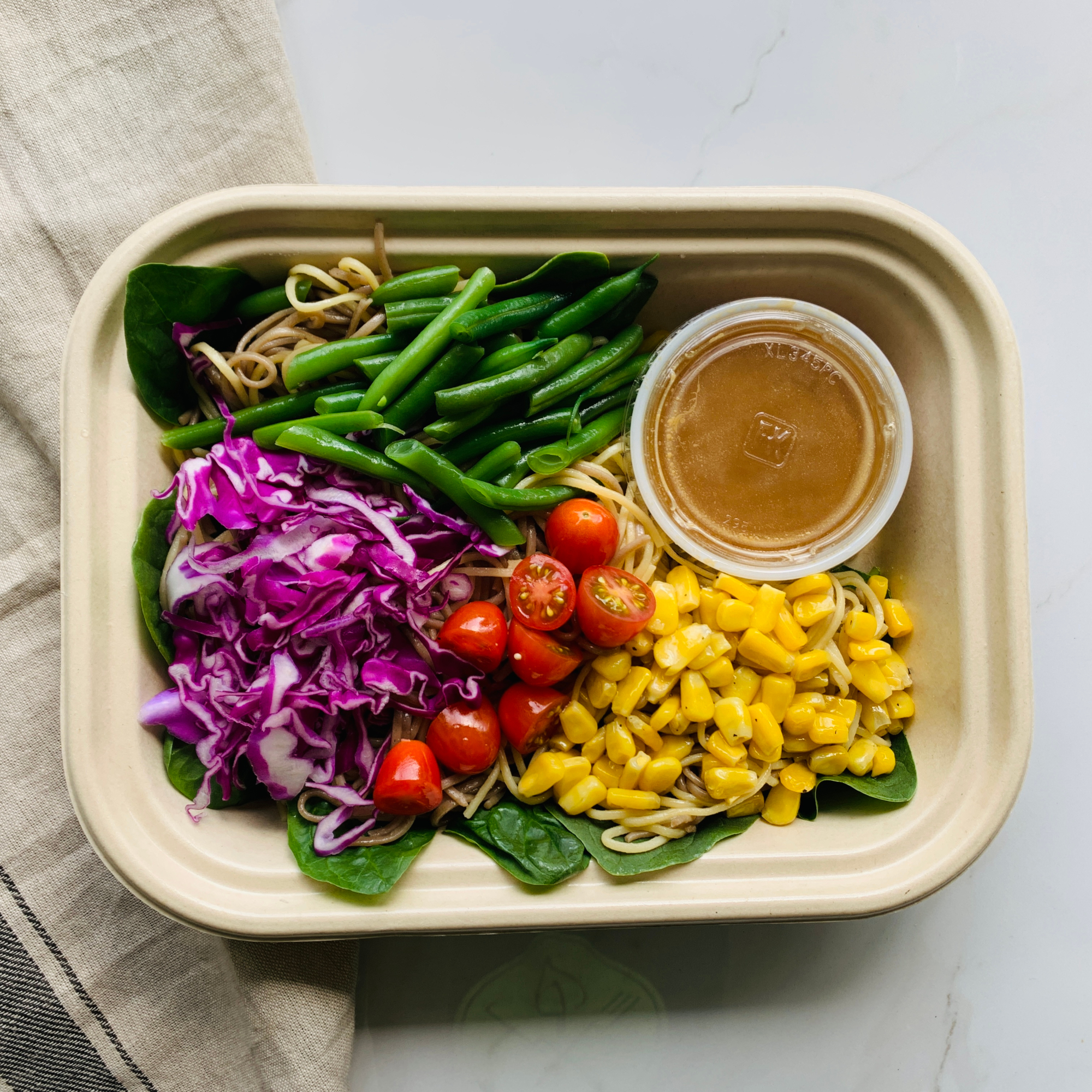 Cold soba noodle, spinach, sweet corn, shredded purple cabbage, tomato, green bean, and scallion serve with ginger peanut soy dressing and crushed peanut(package separately)
